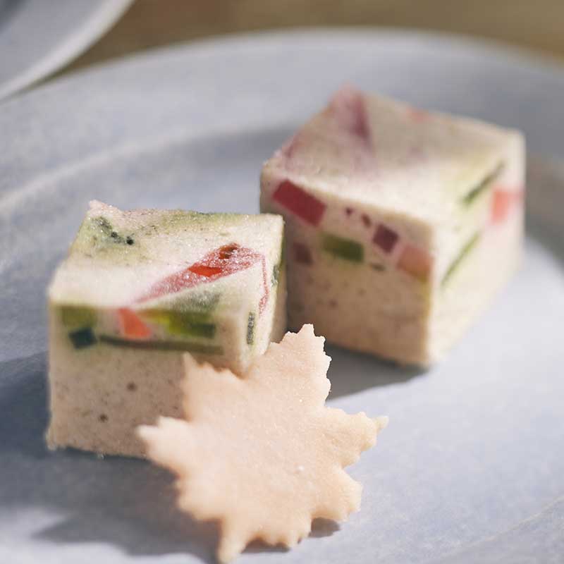 茶の湯を広めた茶人として有名な松江藩7代目藩主・松平治郷「不昧公(ふまいこう)」が好んだという「菜種の里」は、菜の花畑に舞う蝶を表現した可愛らしい干菓子でお店の代表銘菓。伝統的なものから、形式にとらわれないものまで幅広く和菓子をつくっている。